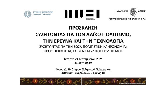 Το Μουσείο Νεότερου Ελληνικού Πολιτισμού του Υπουργείου Πολιτισμού και το Κέντρον Ερεύνης της Ελληνικής Λαογραφίας της Ακαδημίας Αθηνών, στο πλαίσιο των έξι επιστημονικών συναντήσεων που συνδιοργανώνουν με γενικό τίτλο Συζητώντας για την Ζώσα Πολιτιστική Κληρονομιά: Προφορικότητα, Έθιμα και Υλικός Πολιτισμός, σας προσκαλούν στην τέταρτη συνάντηση με θέμα Συζητώντας για τον λαϊκό πολιτισμό, την έρευνα και την τεχνολογία, που αφορά στη σημασία της τεχνολογίας για την προαγωγή της έρευνας και της ουσιαστικής διαφύλαξης της υλικής και άυλης πολιτιστικής κληρονομιάς, όπως αντικατοπτρίζεται στα προγράμματα ψηφιοποίησης, στο έργο και την λειτουργία του ΚΕΕΛ σε ψηφιακό περιβάλλον και τα ψηφιακά εκθέματα του ΜΝΕΠ.