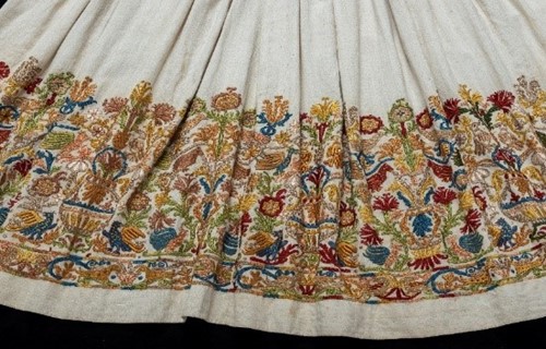 Ποδόγυροι κρητικών φουστανιών του 18ου αιώνα με πολύχρωμο κεντητό διάκοσμο που εικονίζει άνθη, πουλιά, ζώα, φανταστικά όντα, δικέφαλους αετούς κ.α., εκτίθενται στις εκθεσιακές ενότητες «Τι φορούσαν; Τι φοράτε;» - Κτήριο 8 και «Εκείνες πως δούλευαν; Εσείς πως δουλεύετε;» - Κτήριο 10 της μόνιμης έκθεσης του Μουσείου Νεότερου Ελληνικού Πολιτισμού.