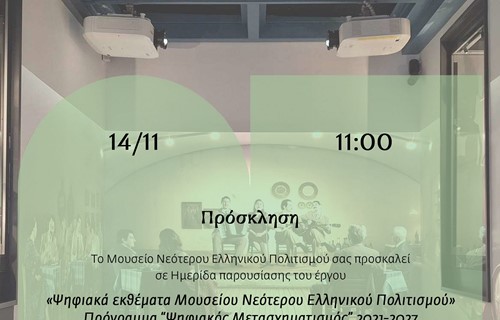Στο πλαίσιο της ολοκλήρωσης του έργου "Ψηφιακά Εκθέματα του Μουσείου Νεότερου Ελληνικού Πολιτισμού", στο Πρόγραμμα "Ψηφιακός Μετασχηματισμός" 2021-2027, πραγματοποιείται την Παρασκευή 14 Νοεμβρίου 2025 και ώρα 11:00 η παρουσίαση του έργου.